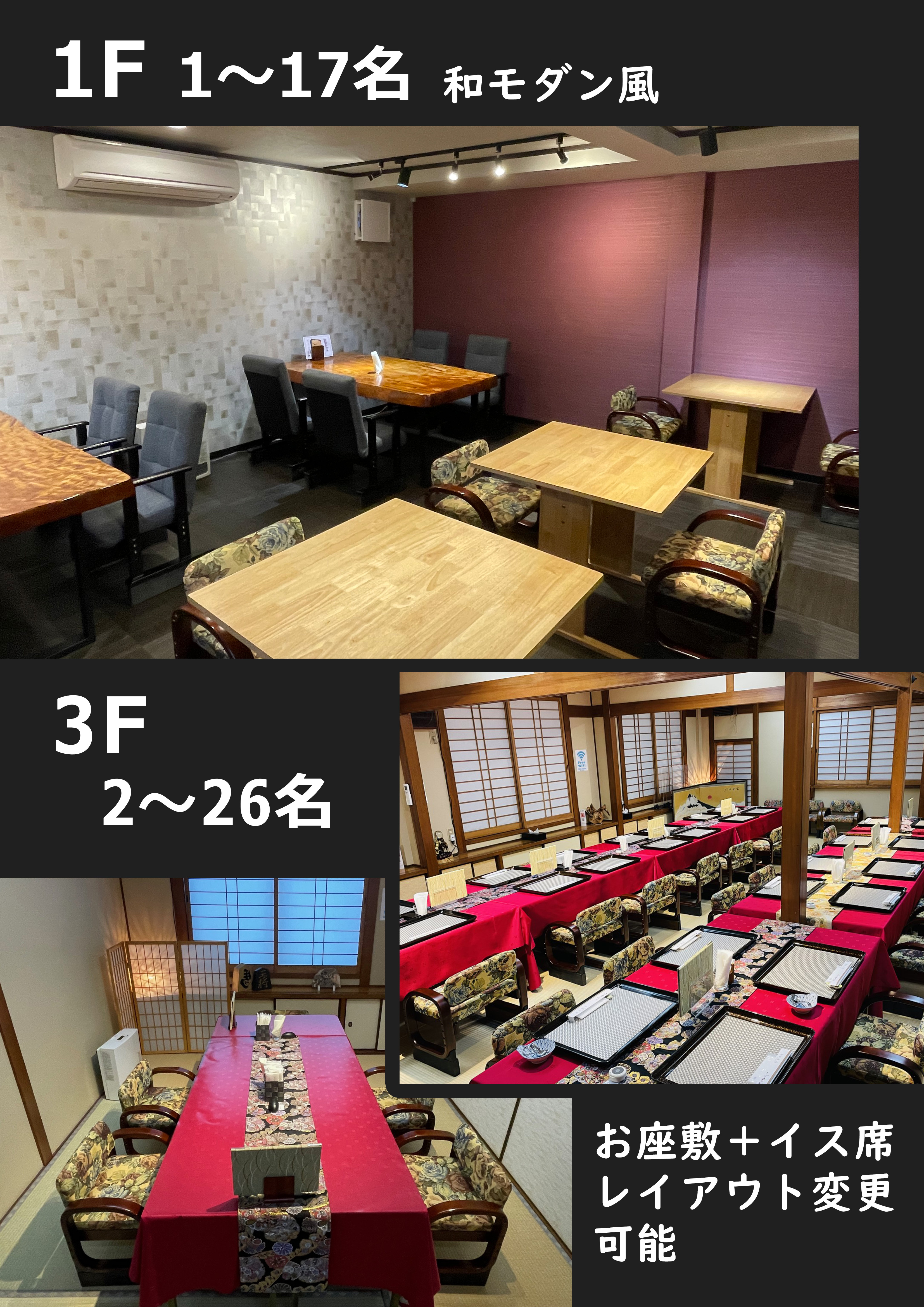 ●3階(畳に椅子席/個室2~26名様)。