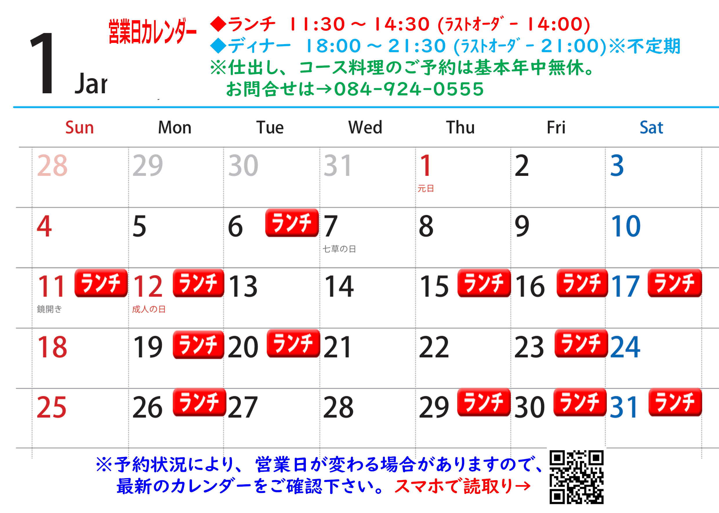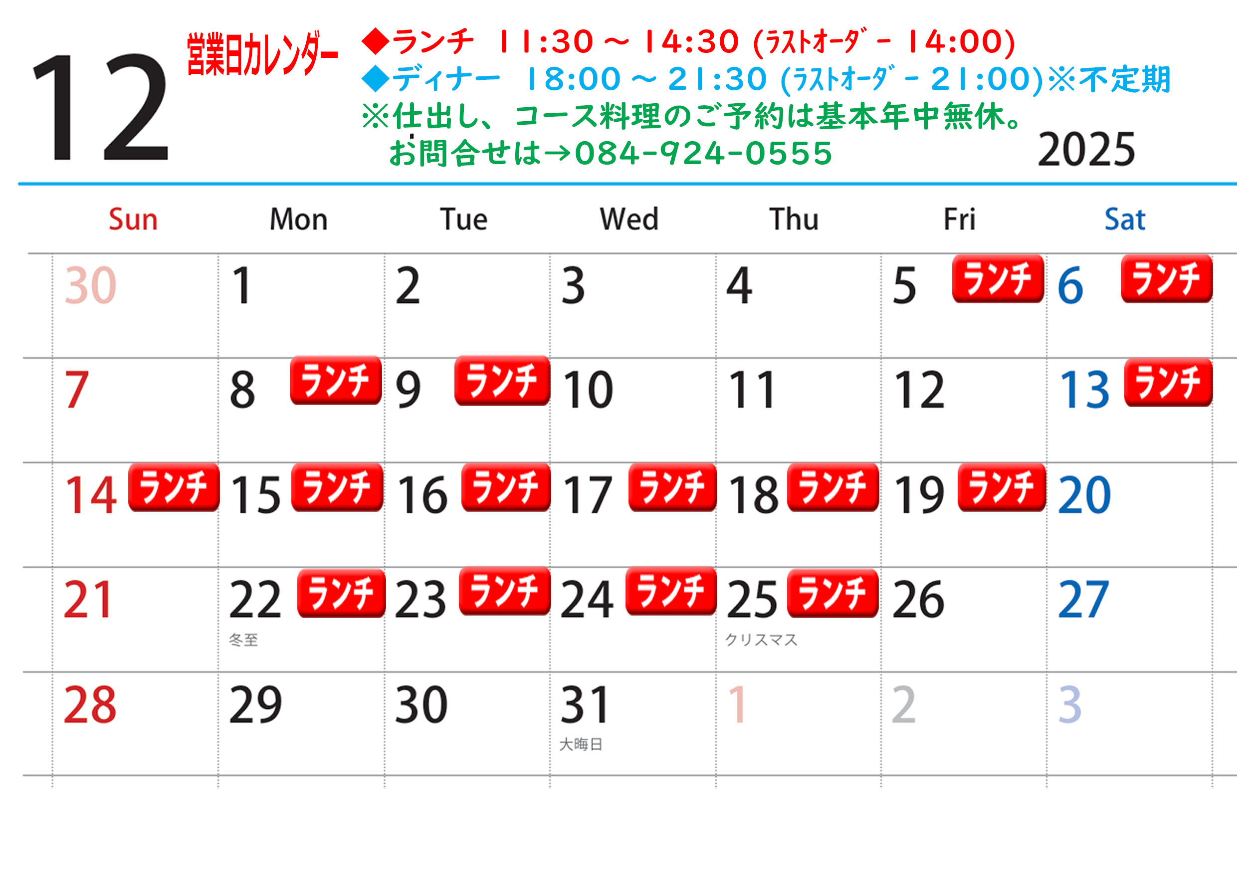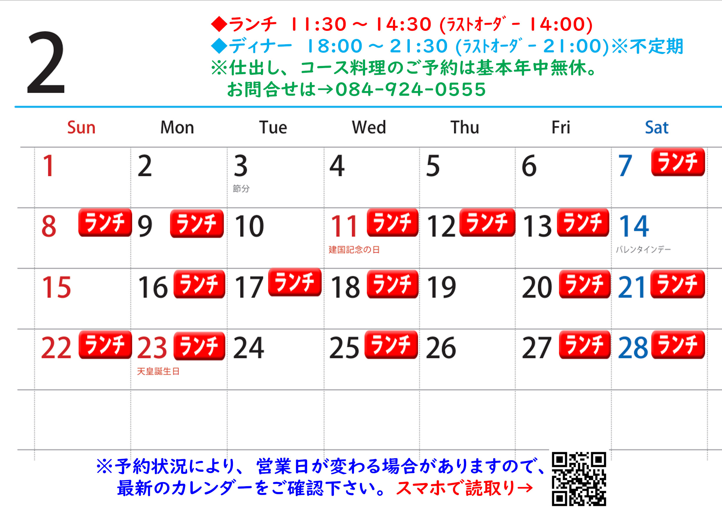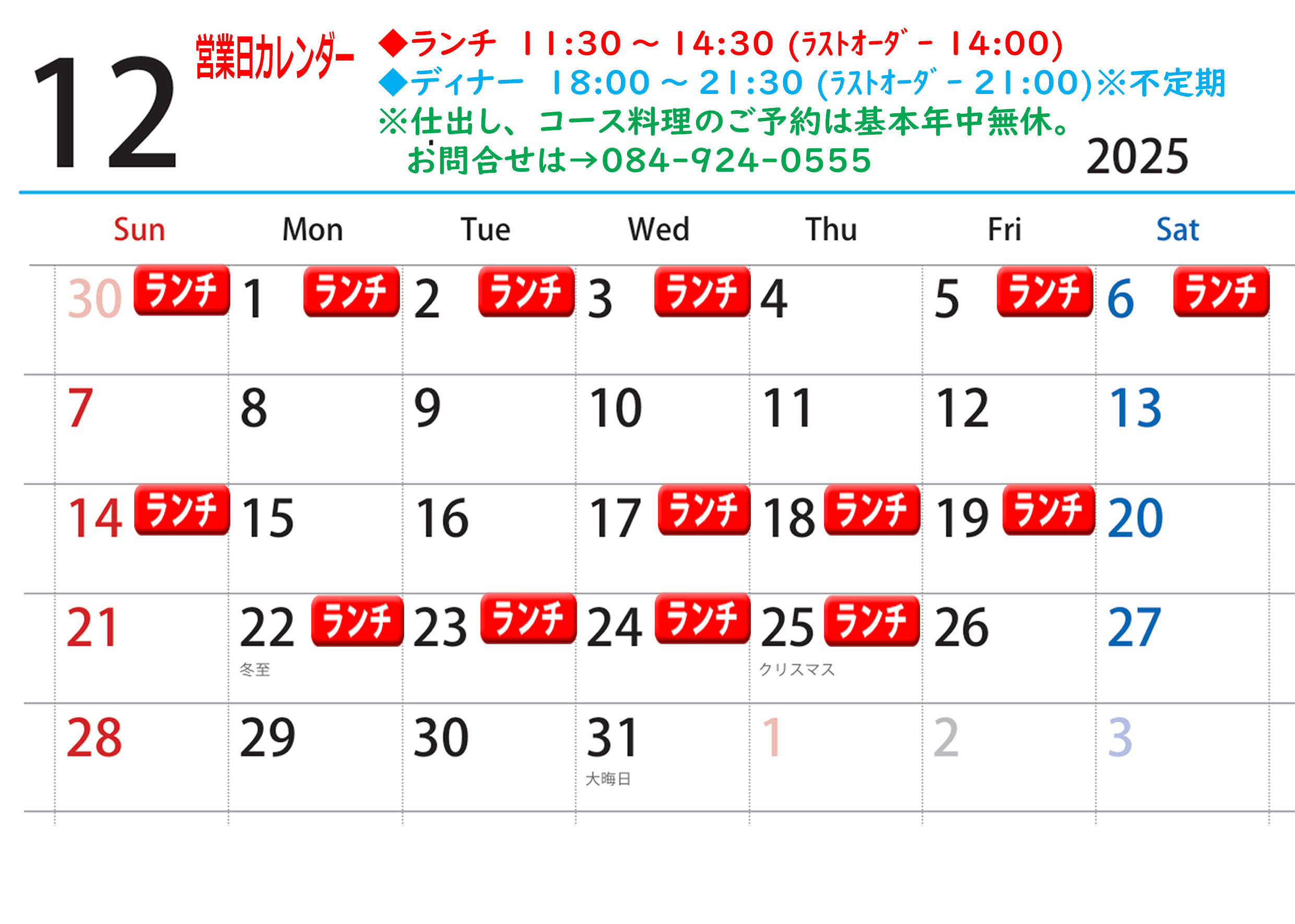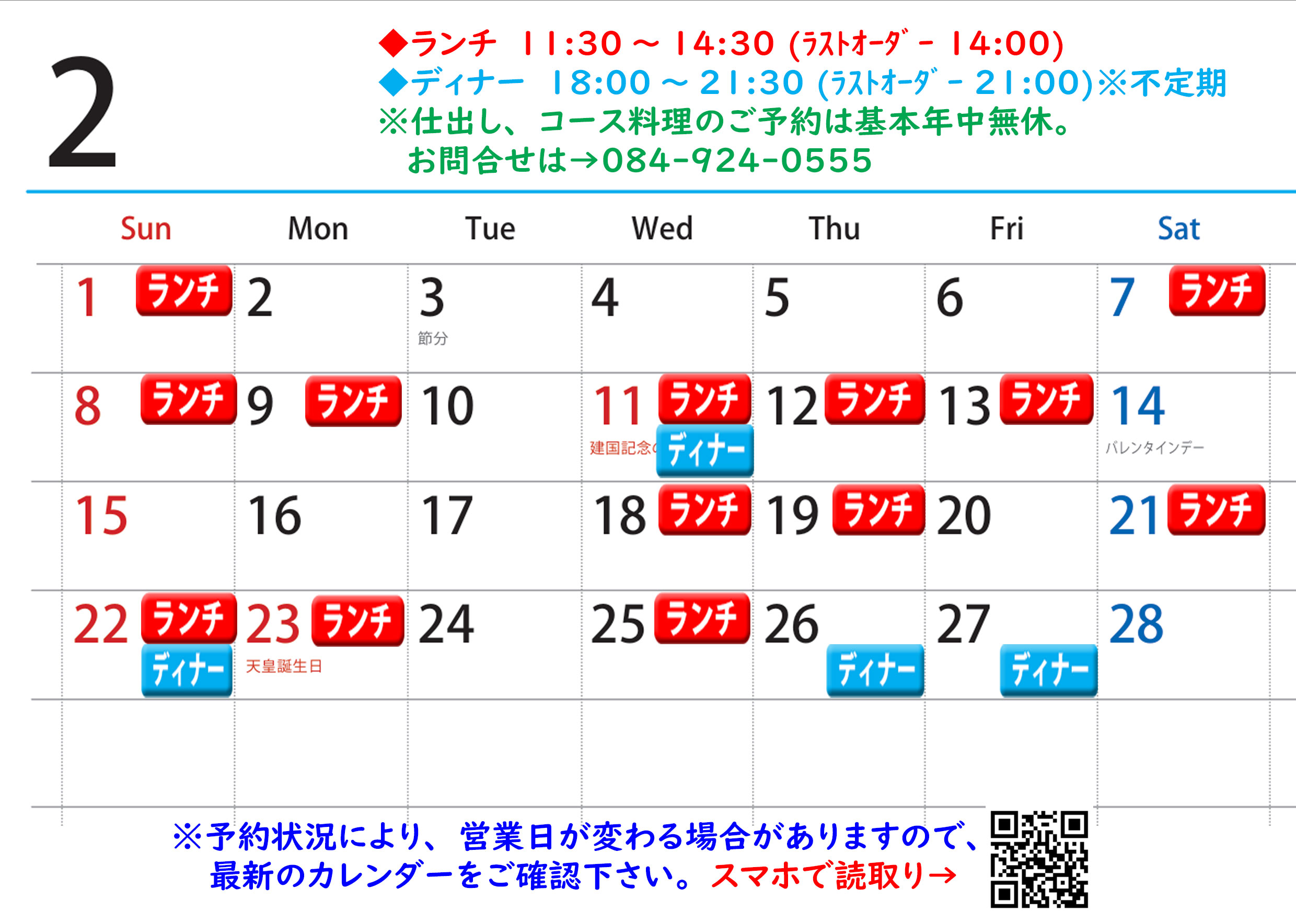 ※コース料理、法要、仕出しは基本年中無休です。お気軽にご相談下さい。 ※ランチタイムは11:30~14:30(ラストオーダー14:00) ※ディナータイムは18:00~21:30(ラストオーダー21:00) ※予約状況により、営業日程が変わる場合がございます。
